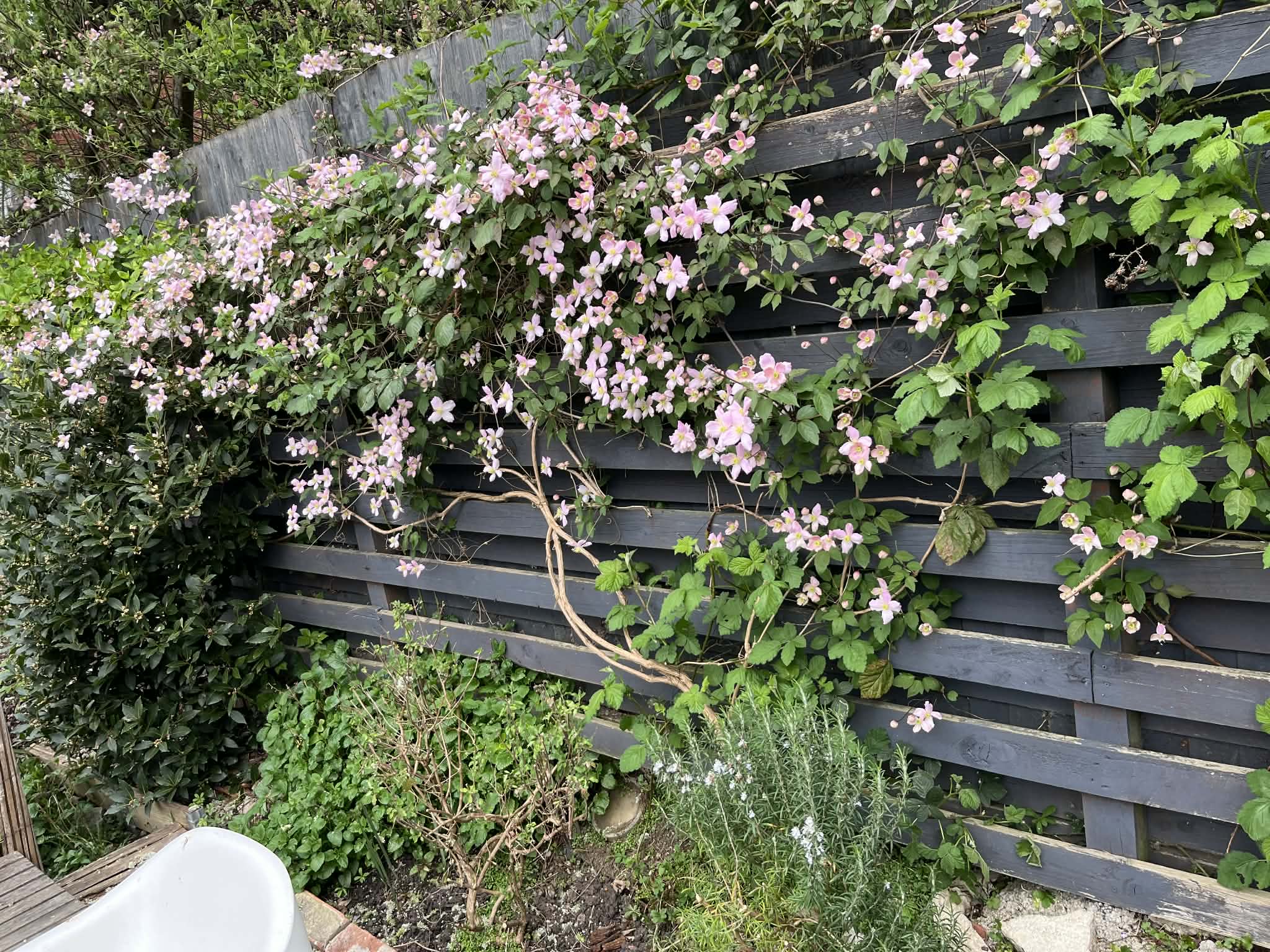 Of late we’ve had some lovely days and then days of greyness and a little rain. Even if we don’t, the garden likes it and is starting to bolt ahead. The clematis which has taken a few years to establish itself is now doing well (above).
