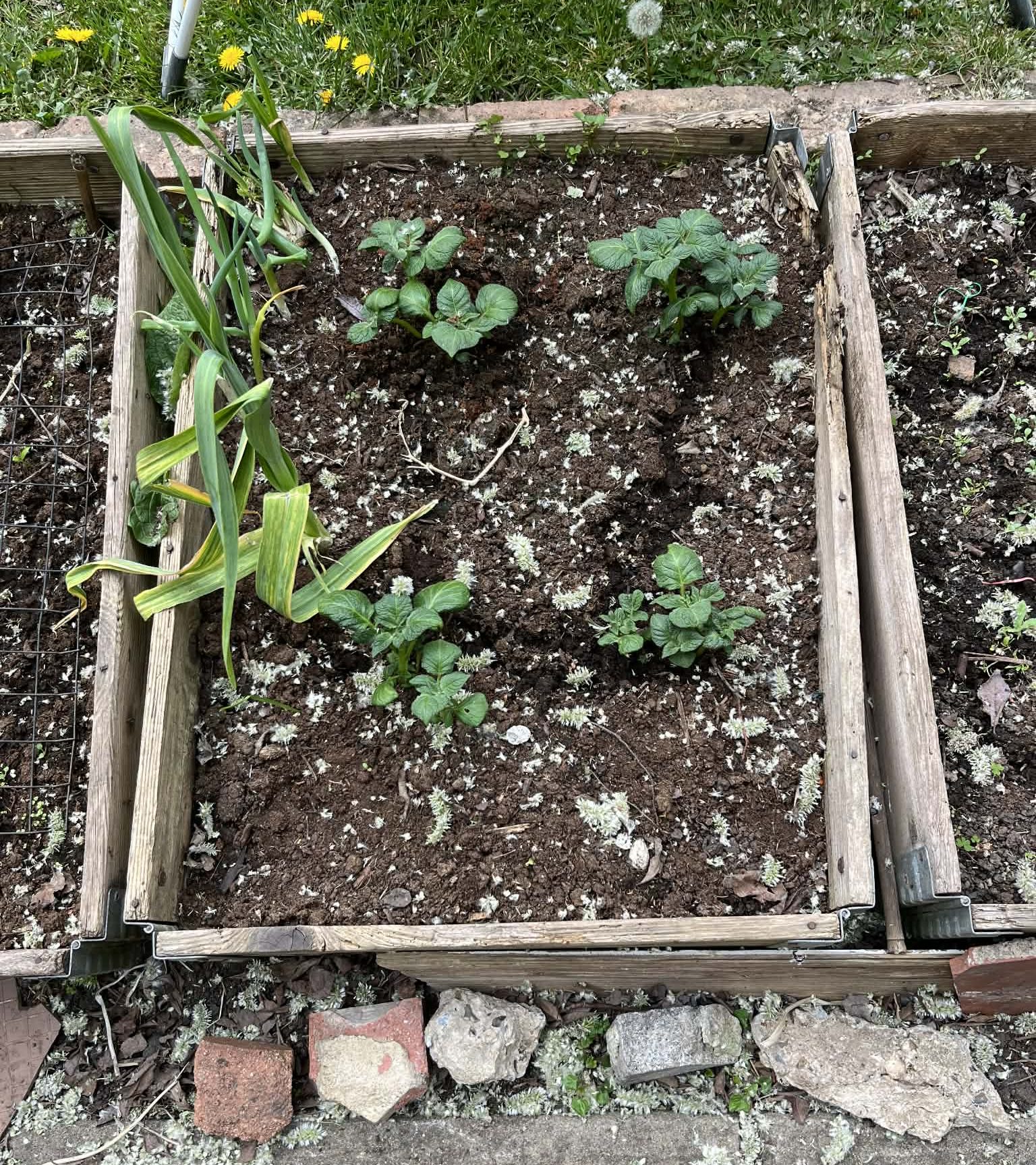 We were thinking had we put the potatoes in too early, but we cover them at night (and on cold days) with fleece and left over plastic and they seem to be doing alright. We will start earthing them up as we go along, as there’s nothing as bad as pulling up your potatoes and finding a load of green ones. We know that’s a long way off yet but it’s good to plan and prepare! Fingers crossed there’s no surprise frosts to come.
