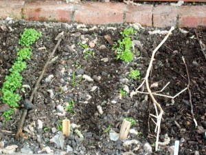 I learnt a few things to say the least and had my introduction to something called “gloves in a bottle”, a shielding cream that protects your hands and the dirt just washes off instantly. It’s gives you the added bonus of actually feeling the soil as you work. Whatever next? Spray on steel toe-capped safety boots? Another good tip learned was to put peas sticks between your rows of seeds to deter Cats. I have trouble with them wiping their behinds in my (OCD straight lined) seed drills after poo-ing, sending the seeds all over the shop! Hopefully that’ll work (below).–