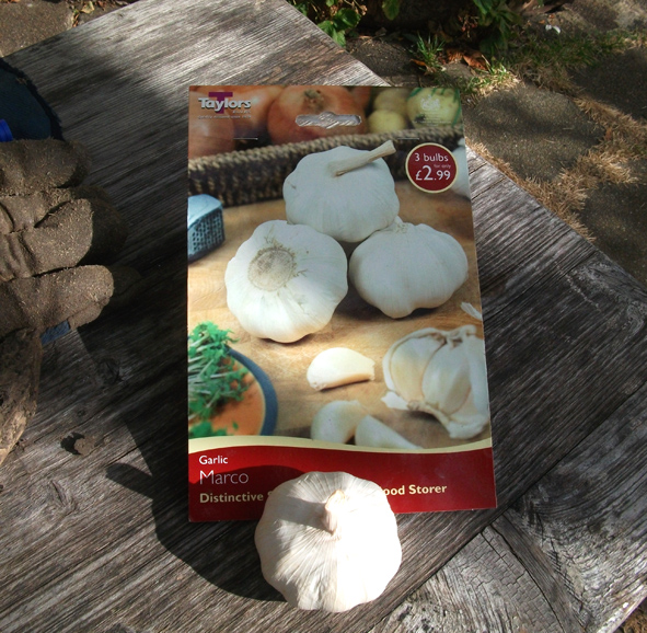 I’ve also started off some garlic. These are from a bulb not unlike the ones you use in cooking. Just carefully break it up and put the cloves in the ground instead of the pot. You don’t want to use any old one from the supermarket as you don’t know what variety it is and if it’s suited to you local climate so get especially for the plot from your garden centre. With planting just carefully put them in (flat end down) with about a quarter of an inch covering over the top so the birds can’t see them and space them about six inches apart. If you’re doing them in rows keep those about 10″ apart. There you go, how easy was that?