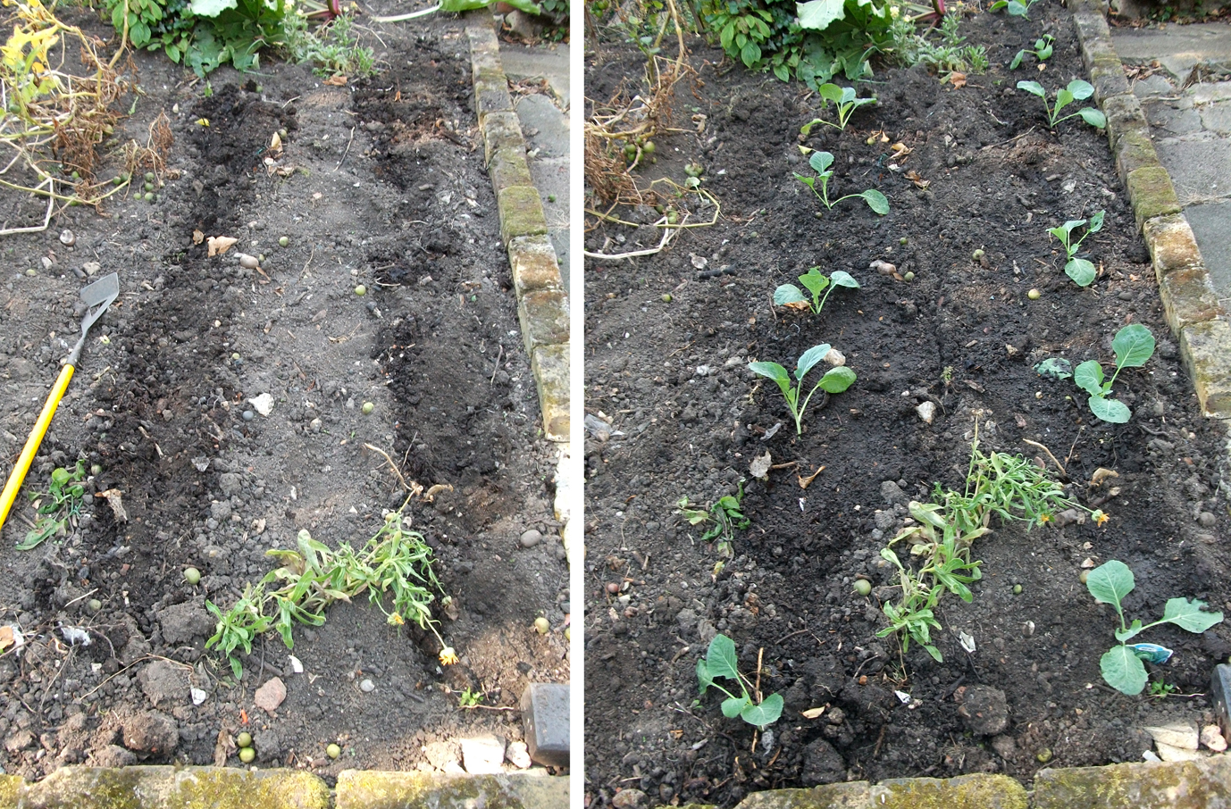I got some over-wintering cabbages, a tray of twelve for £3, which ain’t bad even though my wife thinks the slugs will have them. When choosing something to plant, remember the crop rotation rule, the cabbages are in a different family to spuds, not ideal straight away after potatoes but they’ll do. I gave the area a good old hoe, took out any weeds and stones, made a slight depression and filled the row with a bucket’s worth of compost from the council supplied plastic bin started earlier this year. I spaced the plants out using a trowel’s length as a guide, firmed the plants in and gave them a water before the sun hit the area (I soaked the seedlings in the tray an hour before too). Voilà, two rows of slug food! It’s funny as the night before I watched Monty Don do exactly the same thing (not that I am influenced by the telly or anything, honest!)