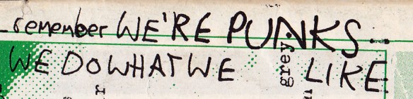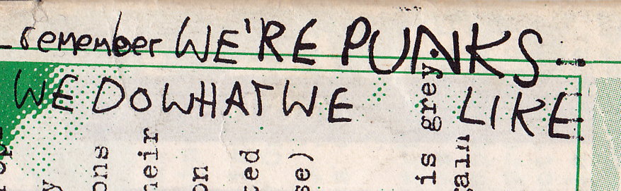 One of the highlights of the discussion was me and my mate (nice one Lee!) getting told off by the girl in front of us for whispering a couple of times through the talk. So much for Punk being about freedom, obviously not! Later on going around the exhibition I got a bit worked up as it featured a copy of Ripped and Torn 17 (All images on this post from that issue). “I’m in that, I’m in that” I excitedly said to my mate. Good job I didn’t have a drink beforehand as I wouldn’t been happy until I had got the staff to unscrew the Perspex panel there and then and take the fanzine down to show to my friend. Good job I didn’t, as looking at that Ripped and Torn again this morning I found the mention, very very small at the back of it in biro (below).