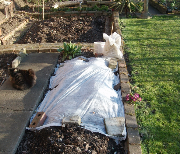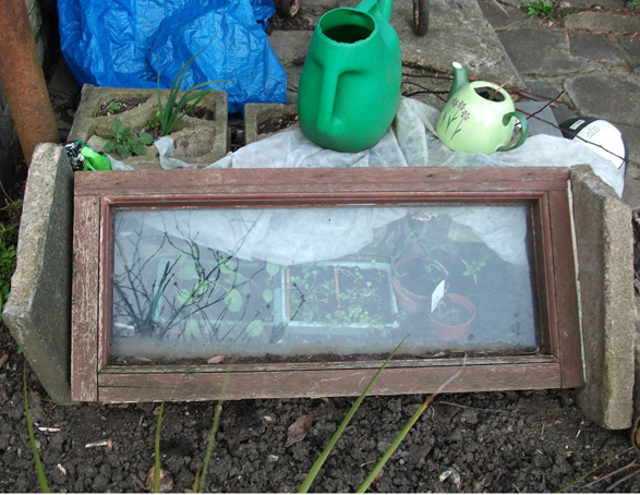 This week has been a lot better on the weather front. Last Sunday I “tipped around” in the back, stuck in the last of the seed potatoes (5″ deep just to avoid any future frosts!), weeding and generally tinkering around and also sowed indoors some different varieties of basil (cinnamon, lemon and also lime, great eh?). I also moved some cabbage and sweet pea seedlings off the kitchen windowsill into the mini cold frame which will start them off on the hardening off journey. I take the window frame off during the warmer days and put it over at night so they slowly will get accustomed to the outside climate.
