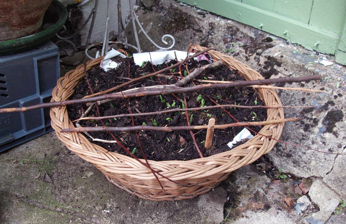 I picked up a great book from the library last week, Veg Street (Grow your own community) – Namomi Schillinger – Short Books which is well suited to us at weeds. There’s stuff on how to set up a community gardening group, front garden vegetable growing and lots of tips and tricks in a shoestring style. It goes over the basics, soil types, pricking out, composting, gardening terminology etc in a no nonsense style, making it perfect for the beginner grower or someone who knows a bit too. I was so influenced by the idea of recycling mad things as plant containers (there’s pictures of suitcases and even tennis ball tubes as veggie plant pots!) I got the old cat basket out of the loft, lined it with an old multi-purpose compost bag and stuck some pea seeds in it for some late season pea-shoots (another influence from the book.) Have a look for it as it’s inspiring!