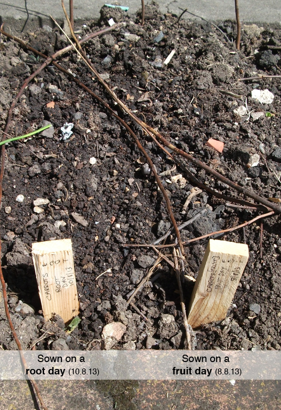 I’ve been using the biodynamic method of sowing seeds for over a year now, I’ve had the odd moment when I’ve ignored it and put the seeds in on “wrong” days but mainly stick to Maria and Matthias’ Sowing and Seed Calendar. The book cost us a about a fiver and the rest is free, just sow your seed on the appropriate Root/Leaf/Flower/Fruit days and that’s it. It’s bonkers and a bit “out there”and works for me but just for fun I’ve set up a quick seed trial. That is, sowed some Carrots on a “Fruit” day (8.8.13) then on a “Root” day (10.8.13) and did the same with some Spring Onions. As there is only a couple of days difference, by rights there shouldn’t be much variation. Come on the Moon, do your job!