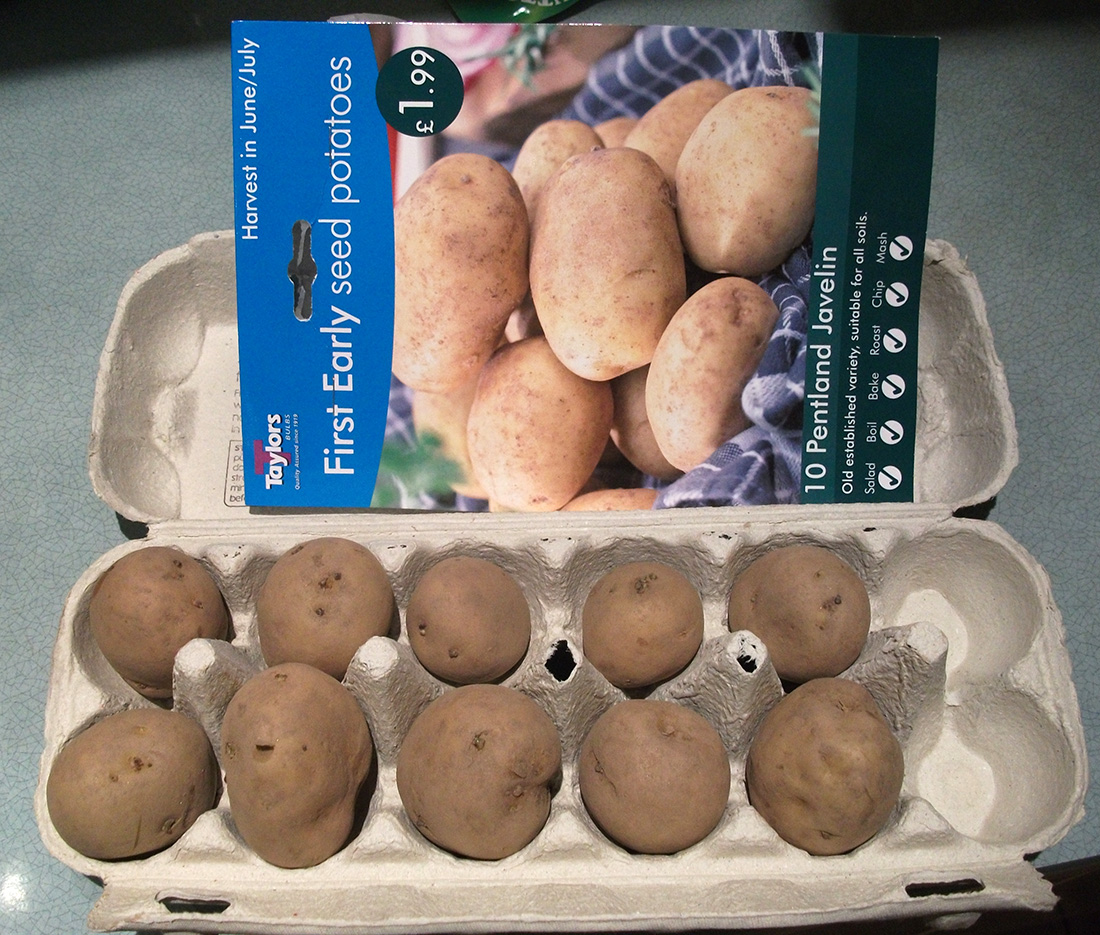It’s definitely that time again! I popped into Shannon’s today as I had a day off work and procured a small pack of first early seed potatoes, Pentland Javelin. Just like the last couple of years I’ve stuck my seed spuds in an egg box with the blunt end of the tuber upwards (the end that has the “eyes”) to give them a head start come the spring (aka “chitting”).The process of “chitting” encourages the seeds to sprout before planting them outside. We’re not talking the long pale shoots that you see when potatoes have sprouted after being stored in the dark, but ones that are short and sturdy.