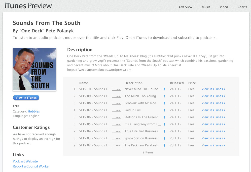 Well, our “Sounds From The South” podcast aired on The Dirt on Fab Radio International last year has all the answers to the above and is now on i-Tunes. Give it a couple of weeks and all episodes will be up there and do look out for new ones coming very soon! Due to copyright we can’t put on any of tunes featured but there’s links to them in the shownotes. Tap in “Sounds From the South” into the i-Tunes store or at the link here. Subscribe, my gardening friends!
