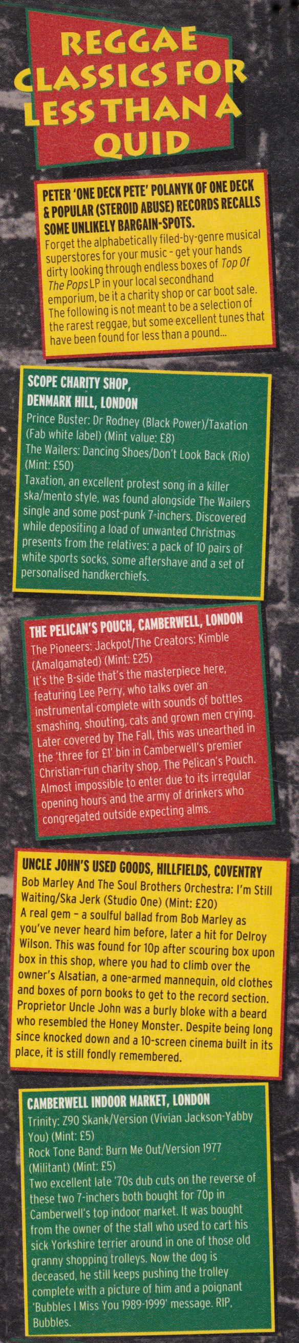 Have you memories of a second-hand record emporium that smelt of rising damp, a sheepskin-coat wearing market stall vendor whose records had no prices on them or a favourite mail order outlet that sent you anything other than the record you wanted? A story of a great tune found between piles of such classics as Singalongamax and I missed again at your local charity shop? You once paid an arm and a leg for the Contempo – Black Jade dub LP from the Record and Tape exchange only to find Status Quo’s You’re In The Army Now 12″ when you got it out of its cardboard sleeve on the bus home. Well we would love to hear from you!
