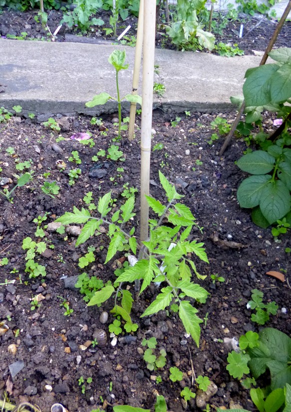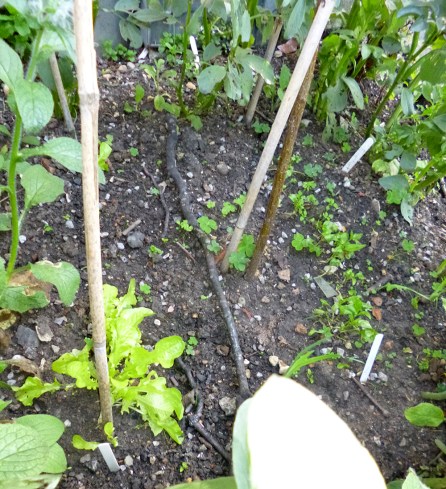 The daft idea we had to stick a row of the lettuce and spinach in the area shaded by some broad beans (so they didn’t bolt) may have not been a good one but here’s what’s going on so far! We won’t even mention the idea of sowing lettuce in the gully between the earthed up potatoes as nothing has germinated there.