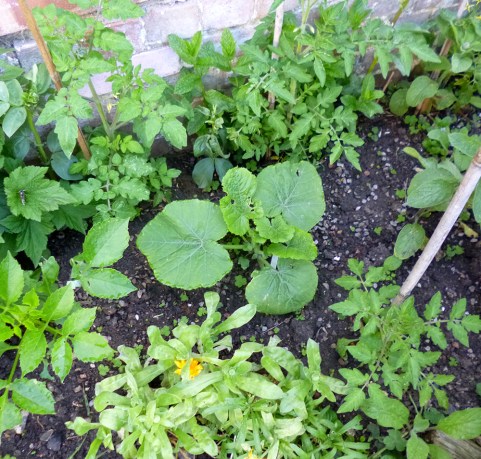 The spaghetti squash is coming on a treat and we reckon we may have put it in the wrong place but “Hey! it’s an experiment”. The other squash that had lots of space to run free has been decimated by the slugs so this is the only one at the moment!