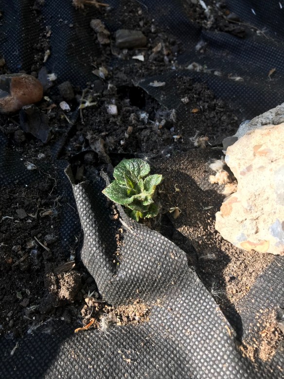 We’ve been noticing that the spuds are starting to show through now so whilst we had the hoe in our hands we started piling just a small amount of soil around the growing tips of the potatoes to protect them from a late frost. Later on in the growing season we’ll carry on with this mounding up (AKA “Earthing up” ) which prevents any of the spuds close to the surface going green. More on “Earthing up” here.