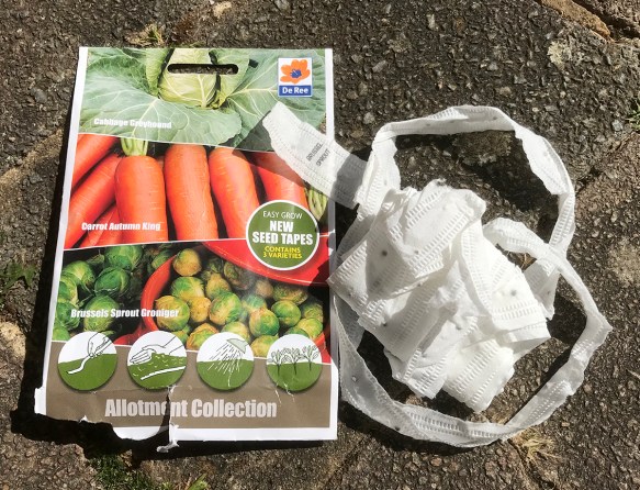 There is a downside to seed tapes we found out after buying a bargain assorted vegetable tape off ebay. Turns out the names of what seeds they are, are only at the beginning of the tape (not all the way through) and now we’ve sowed a few we have no idea what’s what except brussel sprouts. Who told us seed tapes were a good idea?