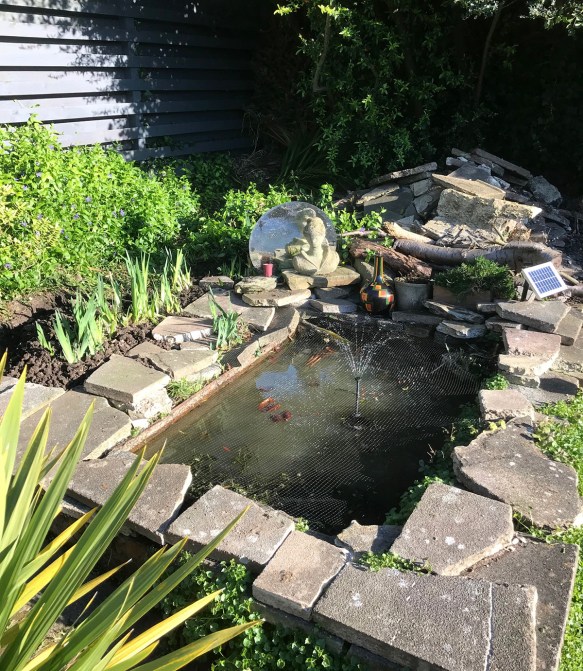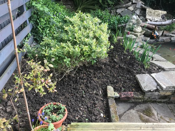 We spent about an hour today clearing around the side bed at the end of the decking towards the pond, right up to the part where we cleared yesterday. There’s a blueberry (the left of the above pic) that has been swamped by that horrible purple plant for a long while now and as we’ve thinned the stuff around it we should see some progress even though they should be in acidic soil not our London clay soil. There’s still a bit to do under the variegated hebe and there’s loads of the creeping plant behind it but we reckon we’re doing okay. The weather’s supposed to be nice tomorrow so we’ll be cracking on.