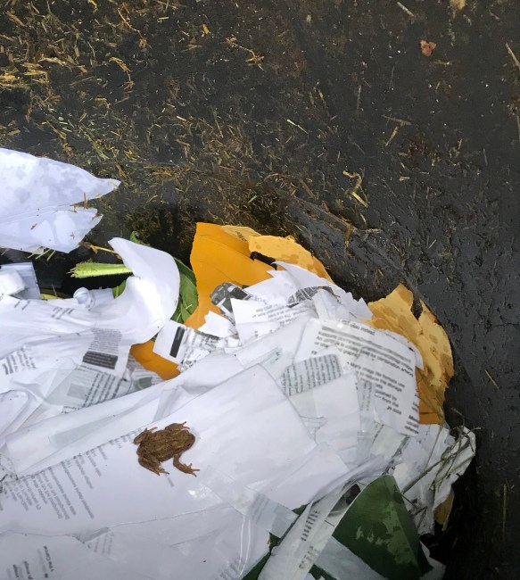 During yet another trip to the compost bin today we threw in a load of ripped up paper with another free bag of guinea pig compost making it one dry heap. A bucket of water was duly thrown on top to compensate and then something moved!