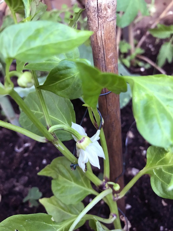 The peppers or chillies or whatever they are, are flowering (top and bottom pics) and there’s some mini-fruits too! We love those raised beds!