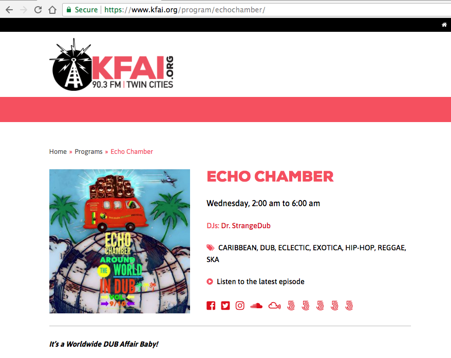 It’s a show worth tuning into if you like reggae, dub and the chilled side of life. And do check out their “Around the World in Dub” sets all available for FREE on the Dan Dada records bandcamp here. Big up the Echo Chamber and KFAI!