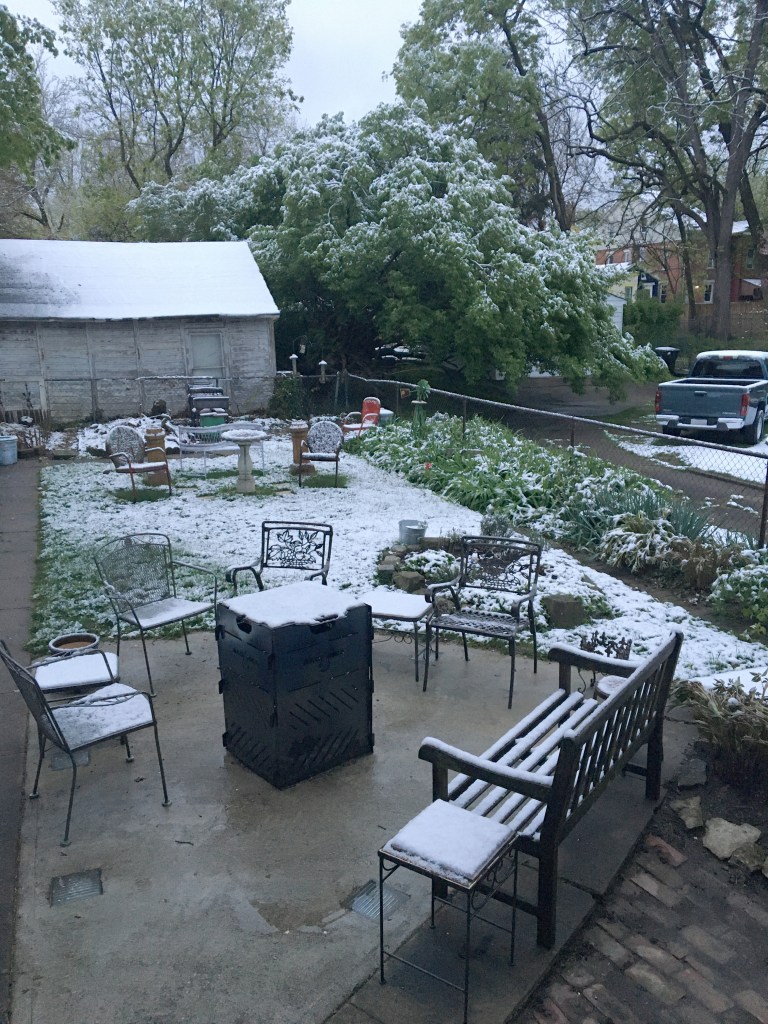 And talking about oddness this thing has just popped up through the soil very close to the pavement in the side bed that has the new fence behind it. We have no idea what it is and we can’t remember sticking anything in that area. It’s a robust looking thing whatever it is. Any ideas?