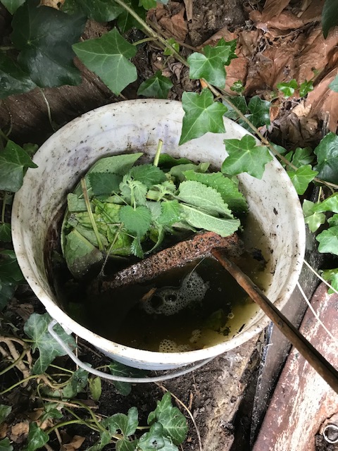 As for smelling and enrichment the comfrey liquid is high on the list for those two properties. The container was ponced off a butcher, the housebrick to weight it all down and the comfrey, nettle and borage leaves all from the garden itself. It’s A1 stuff but blimmin’ reeks, keep it off your clothes!