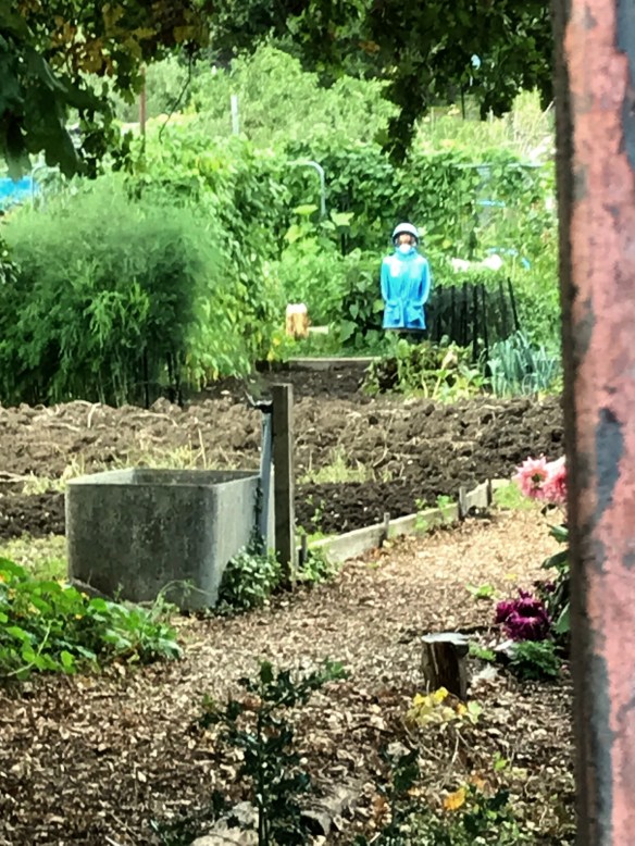 Stevyn from Iron Feather Journal was the first one to suggest us getting a scarecrow and now we’re seriously considering it. Here’s our favourite local one at One Tree Hill Allotments. Very scarey indeed! It’s those hands in the pockets and the WW2 metal helmet that does it for us.