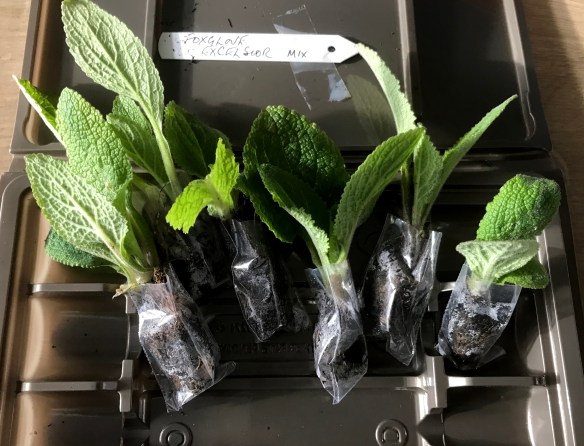 At lunchtime we got some plug plants through the post, some White Foxgloves off ebay (below). Expertly packed or what? They’re not going out just yet even though it said on the supplied notes they can be overwintered in a cold frame. Possibly, but they’re staying on the windowsill for a couple of days before we can knock up some sort of cold frame-like structure with protection outside in the garden. We’re talking an old piece of glass on some bricks or something, it won’t be pretty but it may work. Trouble is we don’t want the plugs to get too comfortable indoors even though they’ve probably come from a greenhouse before being posted.