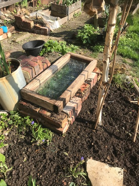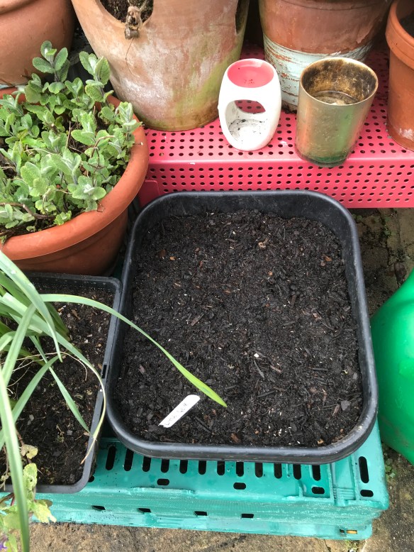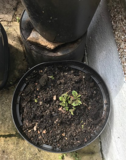 The shoots are coming through from one of the chitted seed spuds we planted in a big pot in a Monty Don style. We’ll stick an old jam jar on the top as soon as we’ve covered it with some more soil as you never know it’s still frost season and it has been cold in the mornings here.