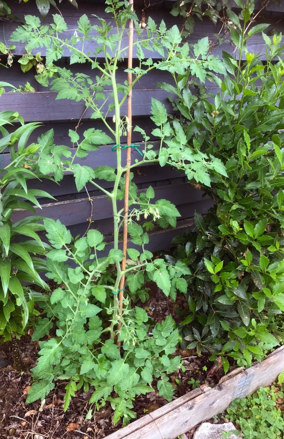 We must have a lot of time on our hands at the moment as we’re giving the tomato plants a weekly dose of comfrey liquid and as the plants aren’t of the bushy variety we’ve been religiously sideshooting (aka pinching out) each plant (we’ve just noticed in this photo we missed one near at the top, damn!) We need to get out more, we really do!