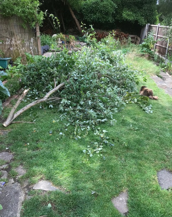 This morning we knew it was going to be stormy later today so went out early in the morning to put the couple of garden brolleys on their sides and then spotted that a couple of branches from the tree next door were precariously being held up by the fence. They had been blown down in the night and we didn’t even hear any wind and thought all of that windy weather was happening later today (which it did).