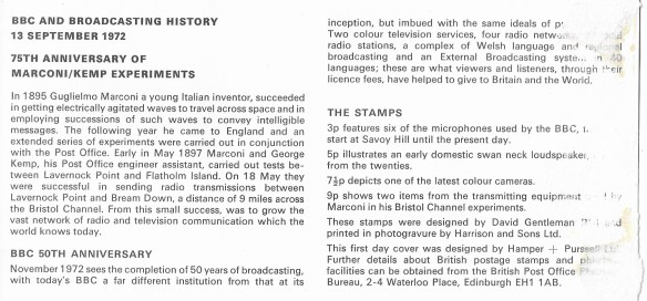 Found amongst the half opened bottles of shampoo, boxes of random electrical leads and general house clearance fare (to a soundtrack of someone wanting a refund from a sale the week previous of an electric good that went up in flames) here’s what we picked up at the Deptford Market for less than a quid this morning. It’s a first day cover from 1972 celebrating BBC & Broadcasting History, well interesting stuff, there’s a nice little inset with info about the featured stamps too. More on the item here.