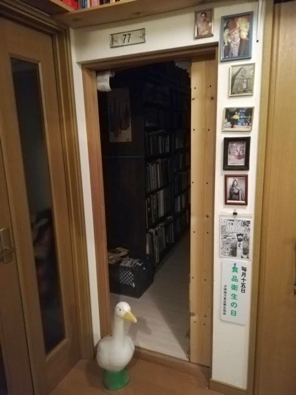 A big hi goes out to Stevyn from the great fanzine/website Iron Feather Journal for sending us this picture above of the first issue of Steroid Abuse up on the wall of his Nandalow Bookshop in Hokkaido, Japan. “The pic is a view into the bookshop, notice at the top of the door (top left) a poetry paper scroll, also featured in the drawing of the inside view (pic below)” “The pictures hanging include the old late King of Thailandwho loved dogs and Richard Francis Burton’s tomb in Kew Gardens”. We love that duck!