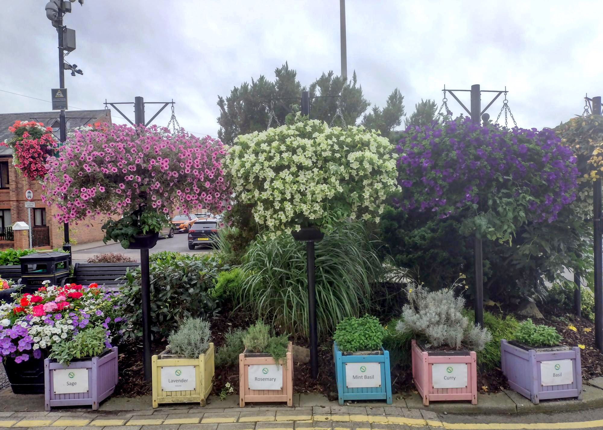 We love the named herb tubs under the massive hanging baskets (top and below image) and would love a cutting of the Mint Basil as we’ve never grown it before. Big shout to the gardeners/volunteers/bus drivers who maintain the patch as it’s immaculate, no deadheads on those hanging baskets we see. Thanks for those pics Debby, they are great. Now if only the Weeds’ garden was as tidy.