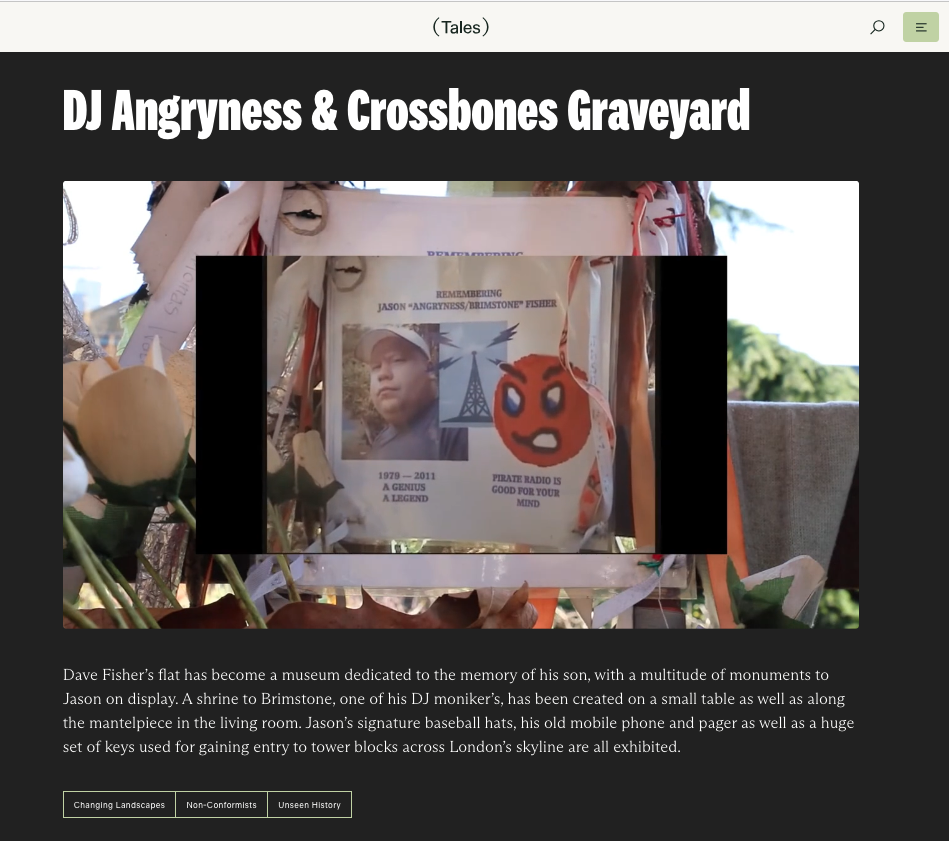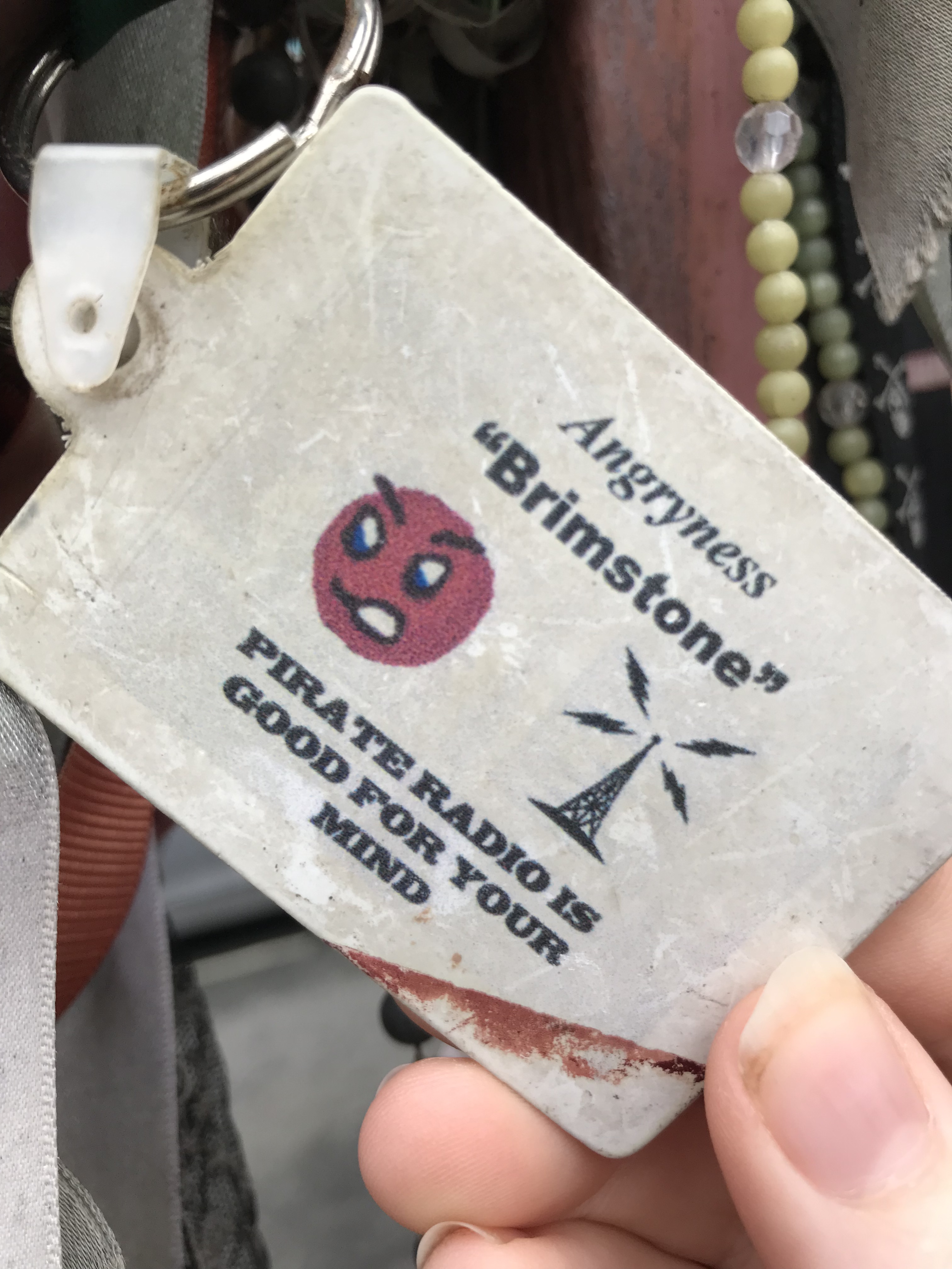 On the outside of the fence which is adorned with ribbons and trinkets we found this card which led us to find out more about Jason ‘Angryness/Brimstone’ Fisher. There’s a wonderful little film on the weeklytales.com blog about Jason by his Dad, David “Dave 500” Fisher and also features a bit on Crossbones Graveyard too. If you love radio you’ll love this film which is at the top of the page here. Absolutely great stuff!