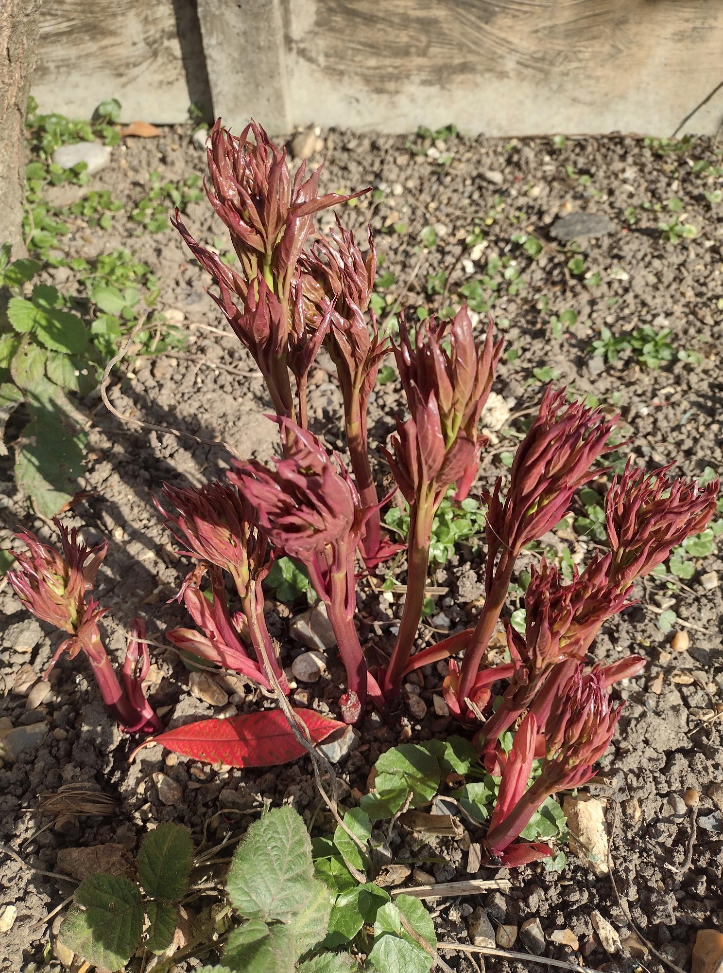 Cheers to Debby H for getting in touch after her time away in Tenerife (pictures of plants from there here) and coming back to a garden “that has sprung to life” in north London. “There are yellow primroses all over plus a few pink, red and white clumps. We had some last year, but nothing like this and the peonies (below) have sprouted and grown amazingly”. Ours are doing the same here too, which is great.