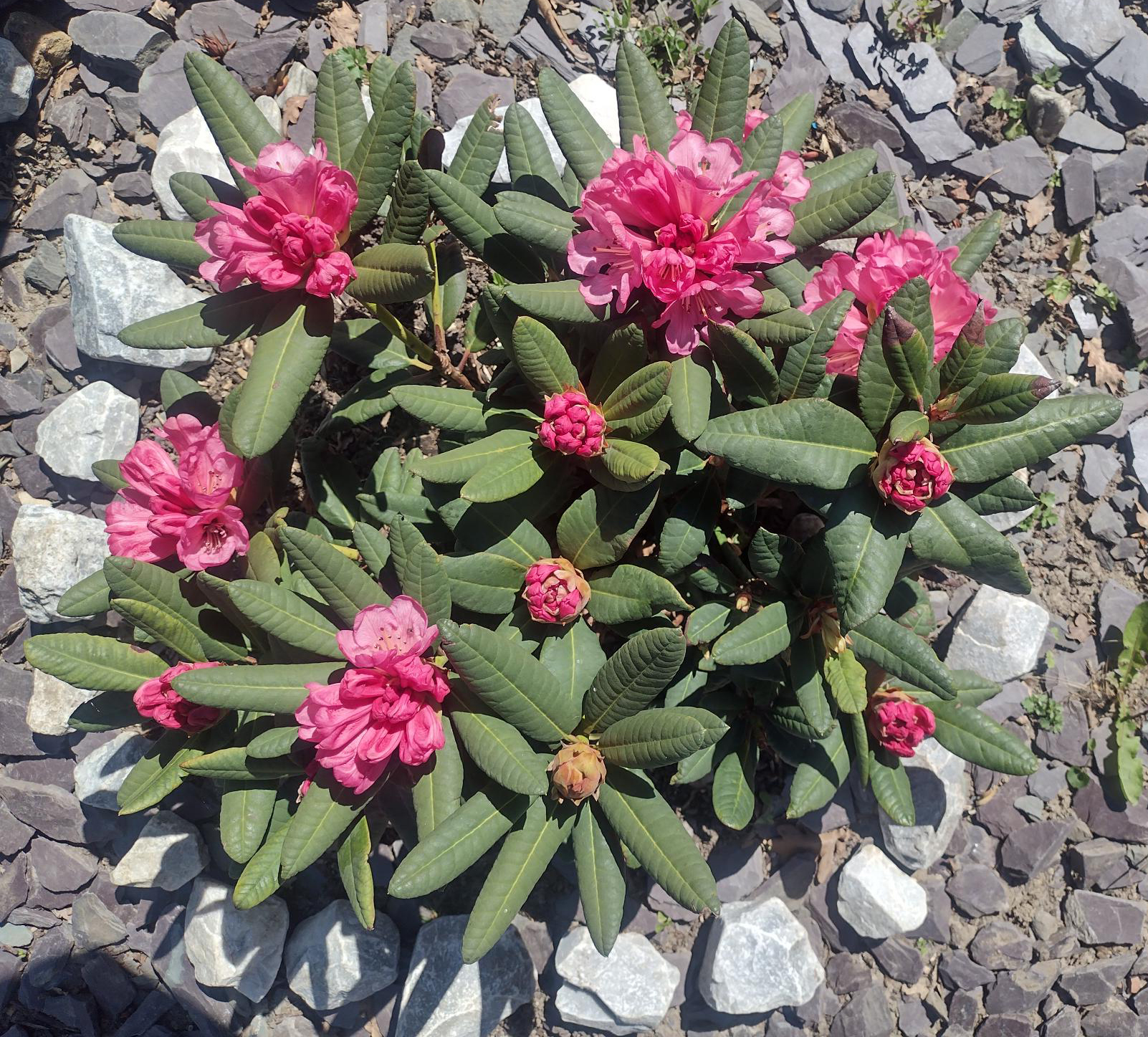 “The rhododendron (below) is Wine and Roses. I saw it in a garden centre last spring. I loved the colour and its name, and decided to break the habit of a lifetime and pay for a plant.” Brilliant stuff.