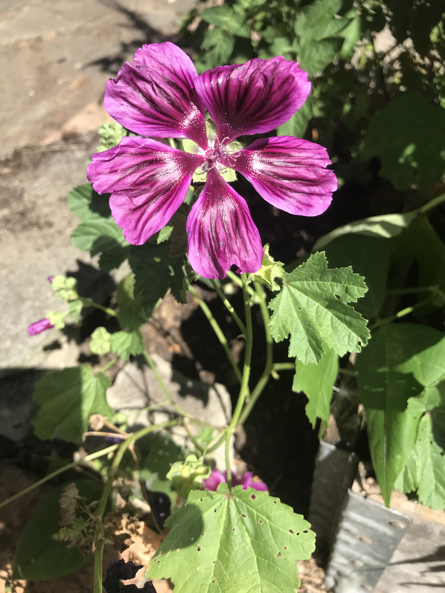Just by the raised beds at the side, there’s a mixture of a couple of cherry tomato plants and this (above). We put the photograph into Plant.id and found out it is a Common Mallow. We then looked at the Wildlife Trust website and they had this to say about it (here) “Certain parts of common mallow are edible (leaves, flowers and seeds) and there is evidence that the Romans may have deliberately cultivated the plant to be used for food and medicine.” It’s not a bad looking flower either and we are not going to pull it up for now.
