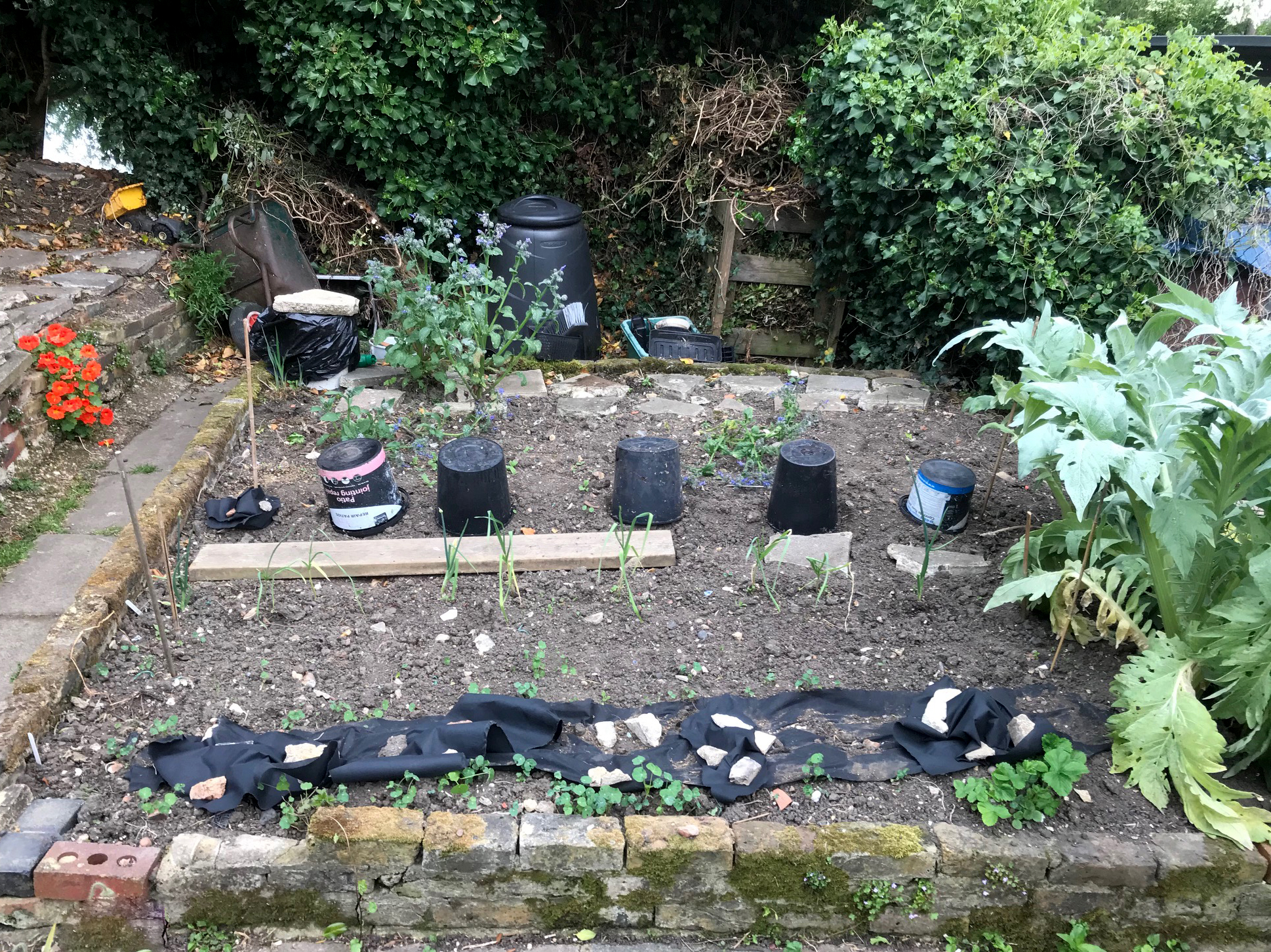 And sick of buying spring onions on a weekly basis, we’ve taken to planting any left-over spring onions in a plant plot by the kitchen rather than throw them away! And why not, waste not, want not and all that.