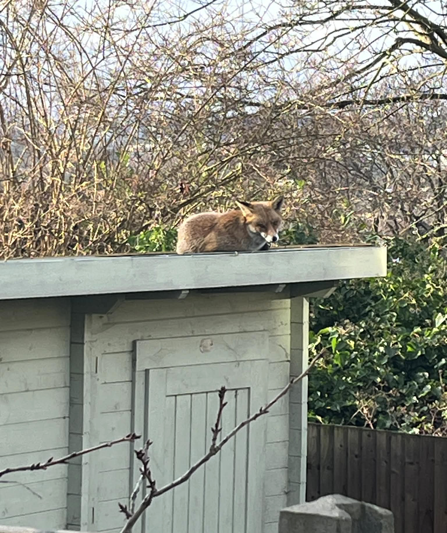 It’s been a nice dry bright day today for a change and it hasn’t been too cold either. Earlier a fox came through the garden just as we were putting an old bucket over the clump of rhubarb shoots. It weren’t bothered with us and the intricacies of forcing rhubarb, rather in the roof of the shed a few doors down. There it stayed for a good few hours.
