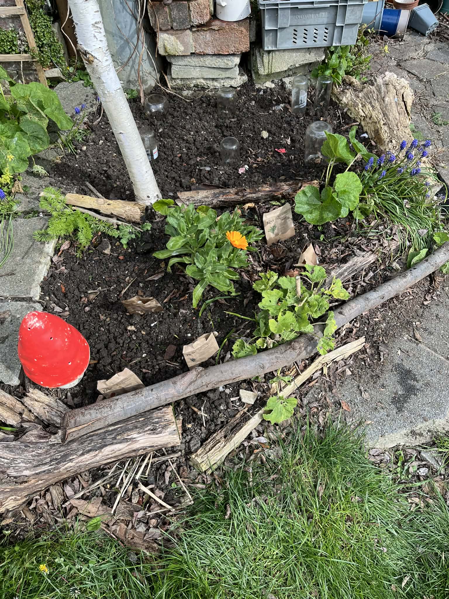 Then at the back of the bed we stuck in the remaining seven seed potatoes of the “Jazz” variety. There’s still going to be some cold nights to come, so when they do sprout they’ll hopefully be protected by the jam jars. Hope there’s been some work in the garden where you are.