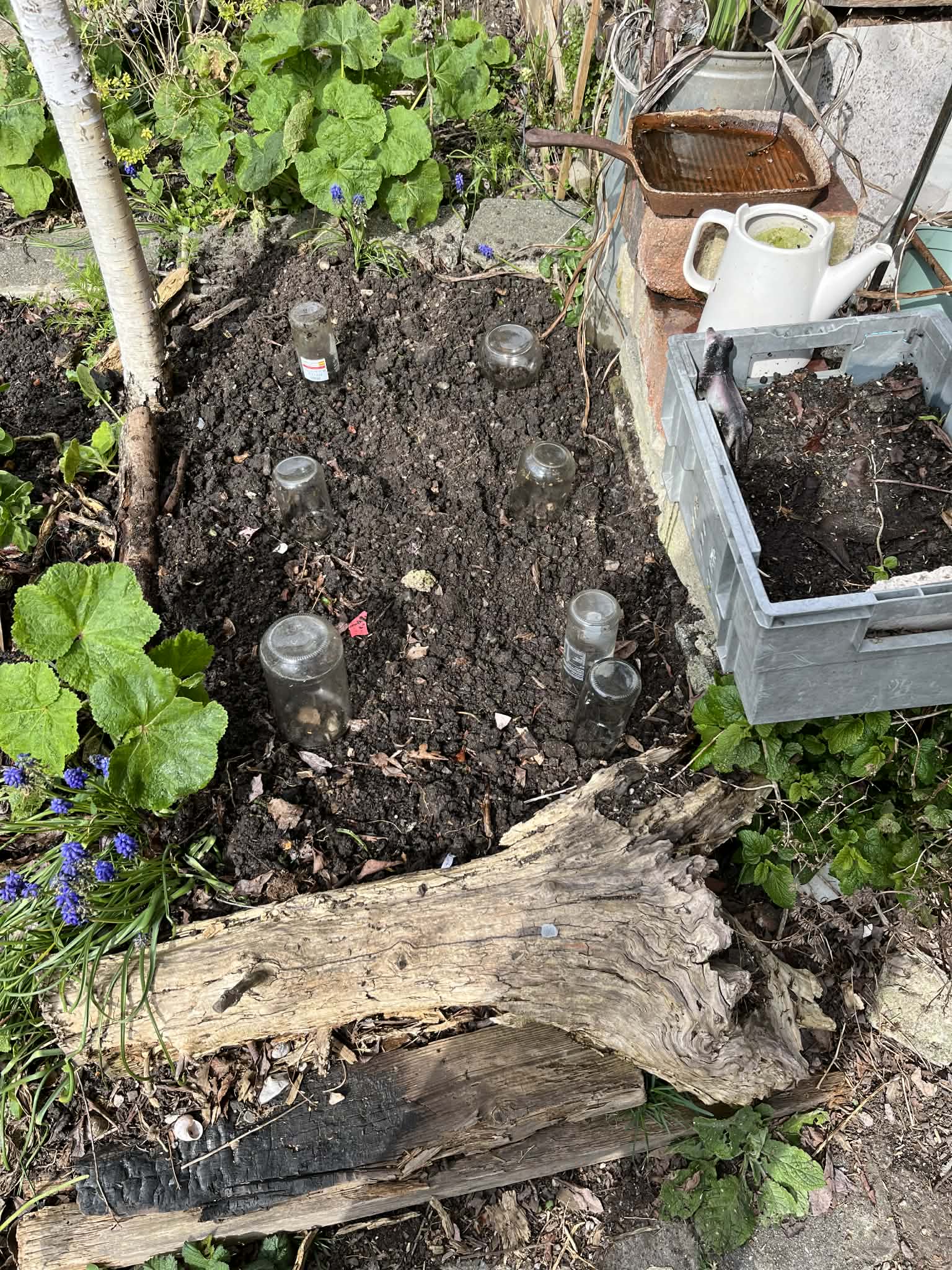 Then at the back of the bed we stuck in the remaining seven seed potatoes of the “Jazz” variety. There’s still going to be some cold nights to come, so when they do sprout they’ll hopefully be protected by the jam jars. Hope there’s been some work in the garden where you are.