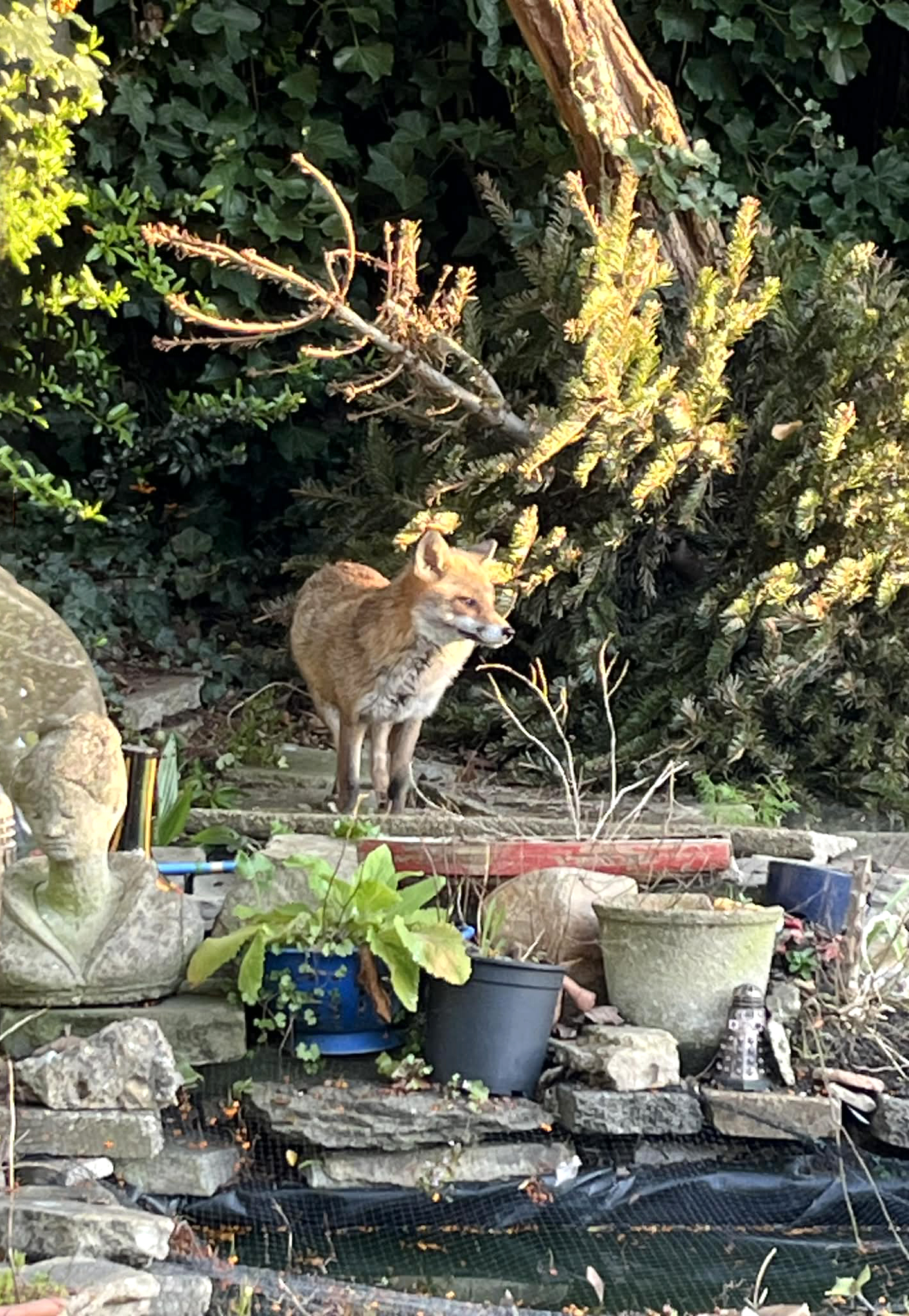 While we were sitting on the garden decking around 5:45pm this evening, enjoying the sunset, a fox strolled in as bold as brass up by the pond and joined us to watch the view. Behind is last year’s Christmas tree and in front to the right, a Dalek of the small variety.