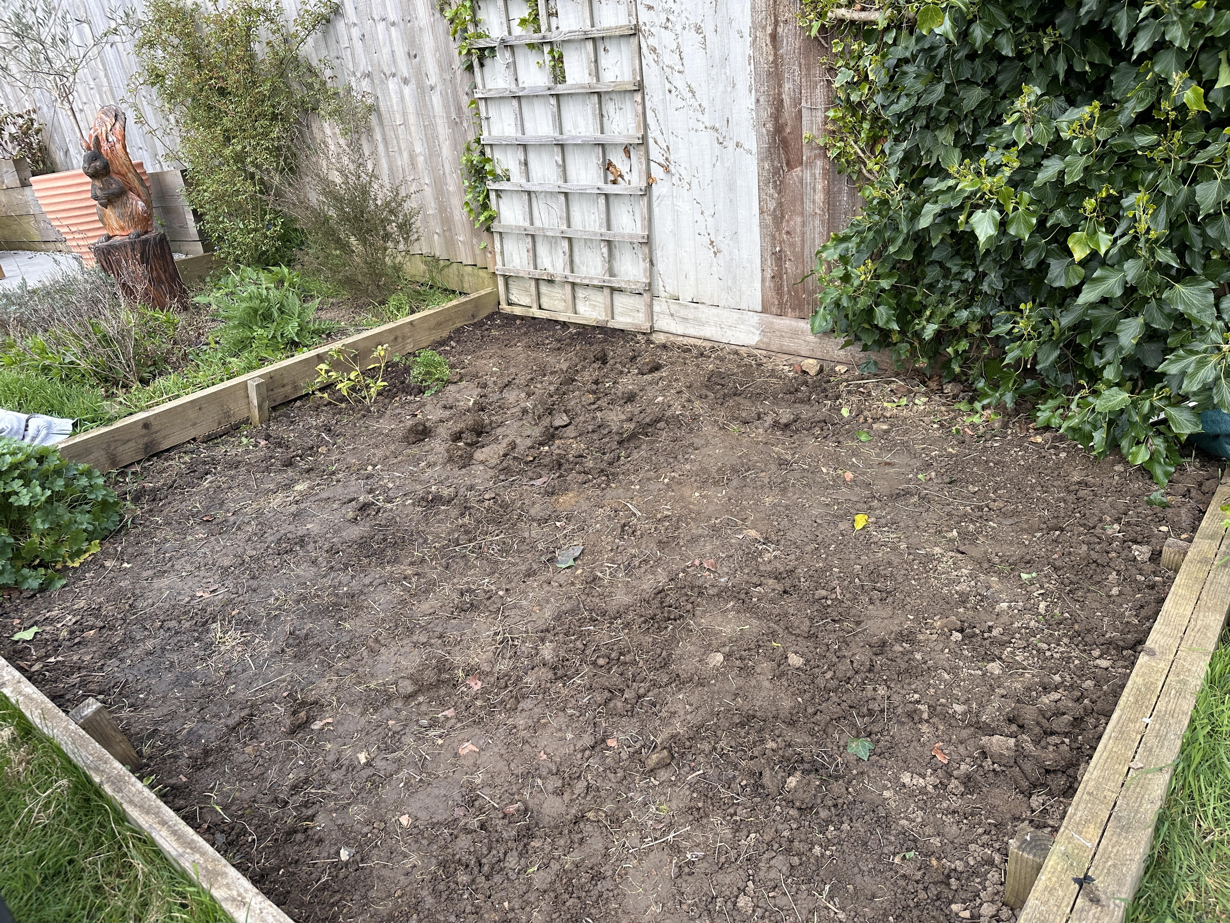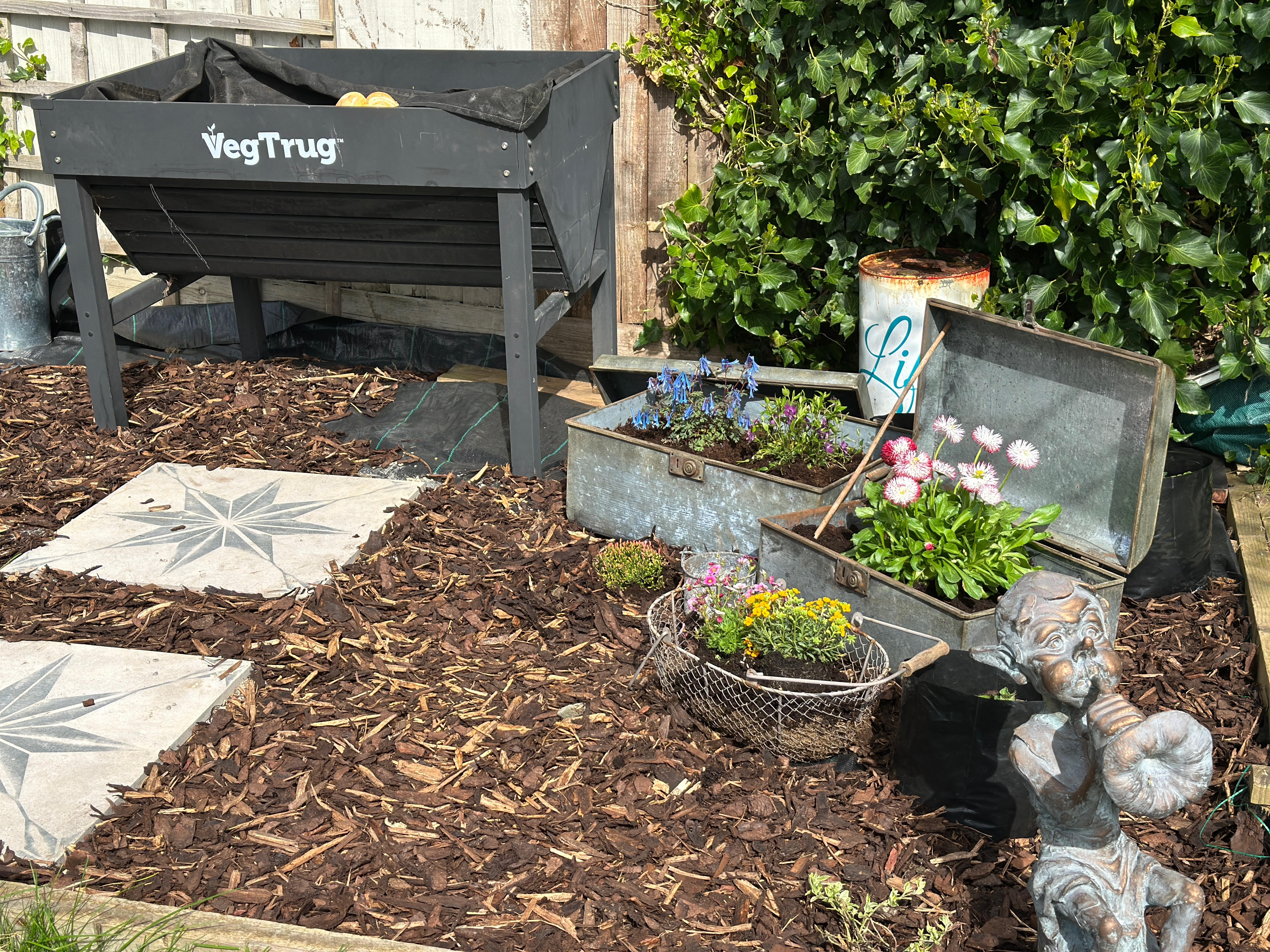He went on to say “We’ve been busy getting a new patch of the garden ready today. Here’s the before and after shots. Still some work to do but you get the general gist. Slabs and bark and a veg trug and some old metal storage tins with flowers added.”