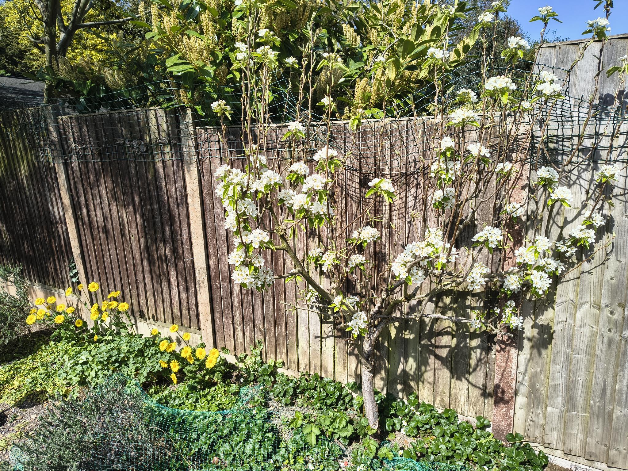 “I thought I would include a picture of our pear tree which has more blossom this year than I remember from previous years. To the left of the tree is the doronicum, which is also blooming well.” There’s a post about the doronicum from March here.