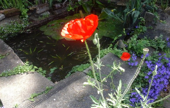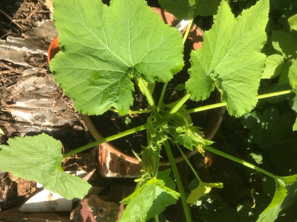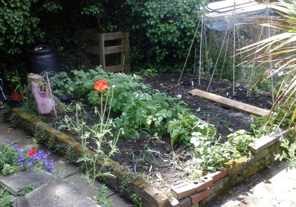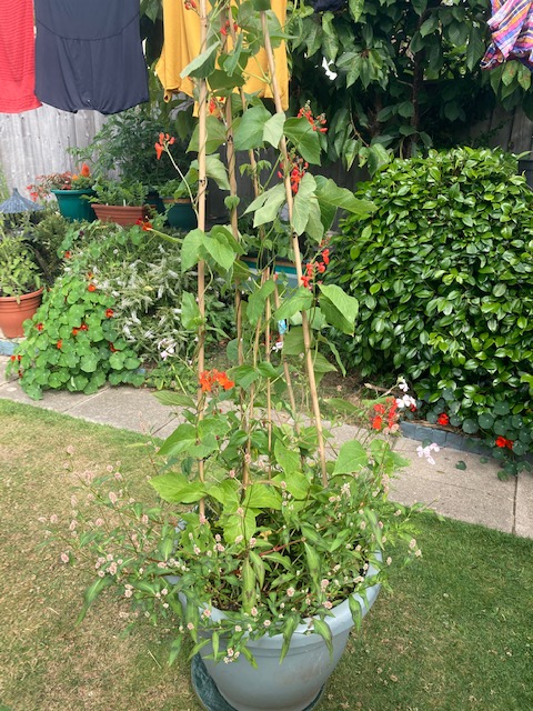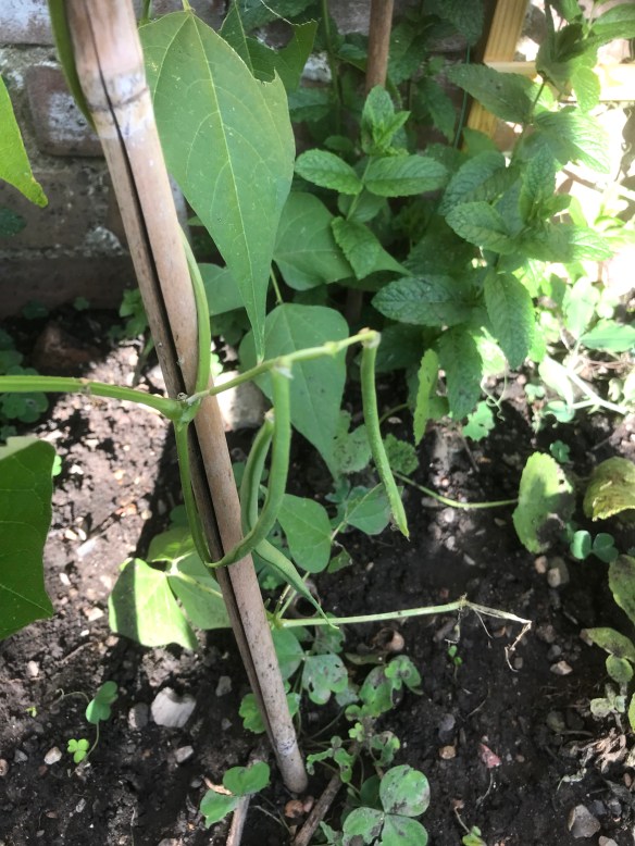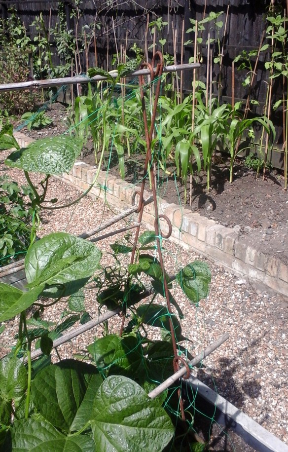 The zucchini/courgette we planted in a in a pot is starting to flower now too and the climbing beans plants we got from Shannon’s are setting fruit on one of the three runner bean cane tripods we put in. As for the other two tripods, one went for a burton through underwater and the other one has been overun with blackfly. It’s strange as there’re only a couple of feet apart from each other.
