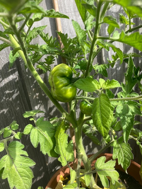 Now some of the flowers have dropped off the tomato plants we’ve been giving them and other fruiting plants a weekly feed of comfrey liquid. We’re also been giving the tomatoes some support with canes and garden wire as in a few week’s time some of the fruit will get heavy.