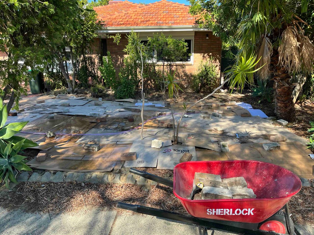 We progressively laid cardboard over the entire garden and weighed it down with bricks then watered it all in, making it mushy and soft and moulding itself into the ground. I’ve been saving up cardboard for the last year, luckily moving house means you have a lot of the stuff on hand. It was great to use all our own cardboard rather than buy it and we also had some concrete around the house from renovations and stuff too. I salvaged a bunch of slabs from the back yard and made a cute little path through the front of the garden.