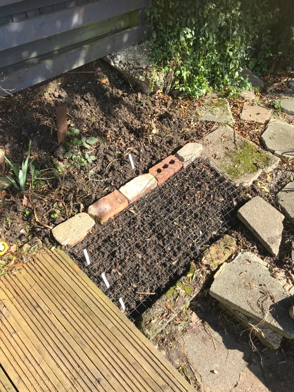 Also we cleared a little area by the pond (below) and added a mini veg bed. We stuck some large wire mesh (originally some shelves from our old mini-plastic green houses) over the top of it to deter the cats, putting in a line of old house bricks in helps visually section the area off too. It gets a bit of shade so we’re thinking the lettuce seeds we put should be okay as in full sun they tend to go to seed. Let’s see.