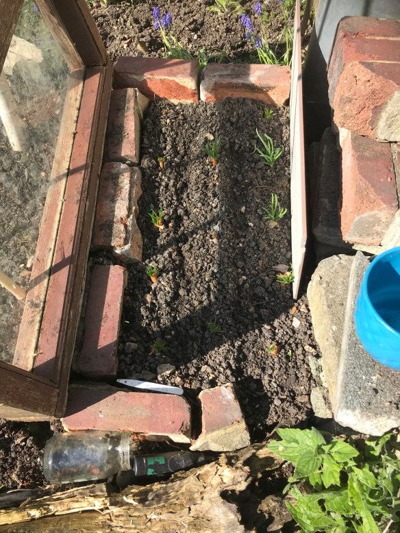 The shallots we put in a couple of weeks ago “under glass” (which is just an old window frame found in the street balanced on some house bricks) are off to a flying start. We’ve tried growing shallots before but they rotted even before they got this far so we must be doing something right this time.