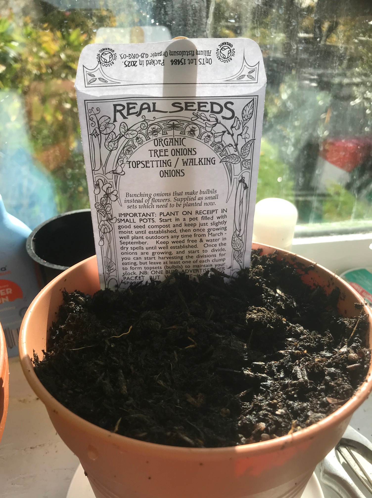 As per sowing instructions for the walking onions, we opened the packet and stuck the bulblets in a pot of compost straight away. Technically, you only buy one bulblet but they generously include extras in case of poor germination, we received four! Along with every order, they send clear growing and seed-saving instructions, and even recipes where relevant. Real Seeds really has its heart in the right place. Their passion for sustainable growing and seed saving makes them well worth supporting so have a butcher’s here.