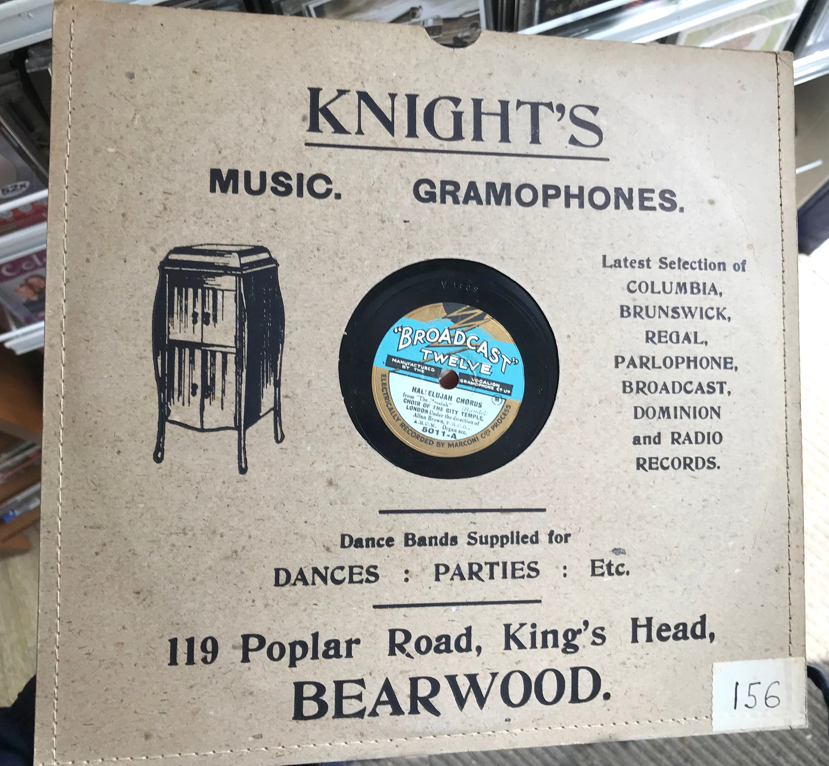 Found in a charity shop in east Dulwich the other day, a nice 10″ with wonderful sleeve advertising the services of Knight’s in Bearwood, Birmingham. There’s music, gramophones and “dance bands supplied for dances, parties etc.” Great stuff! Nice label design too! Anyone out there with some great 10″ 78’s they want to post up? Well drop us a line with some pics.