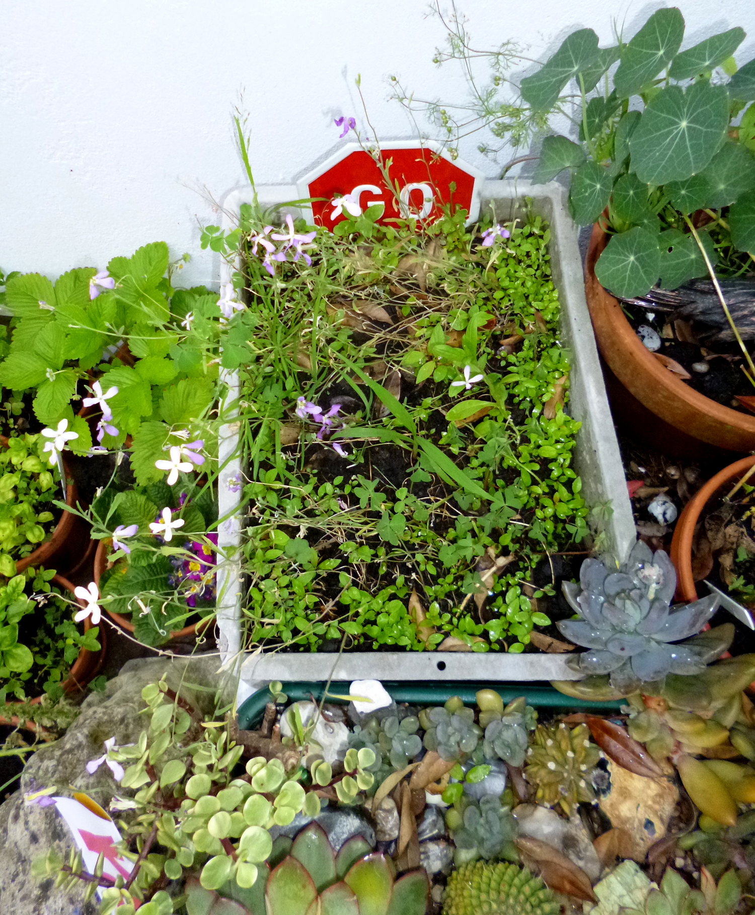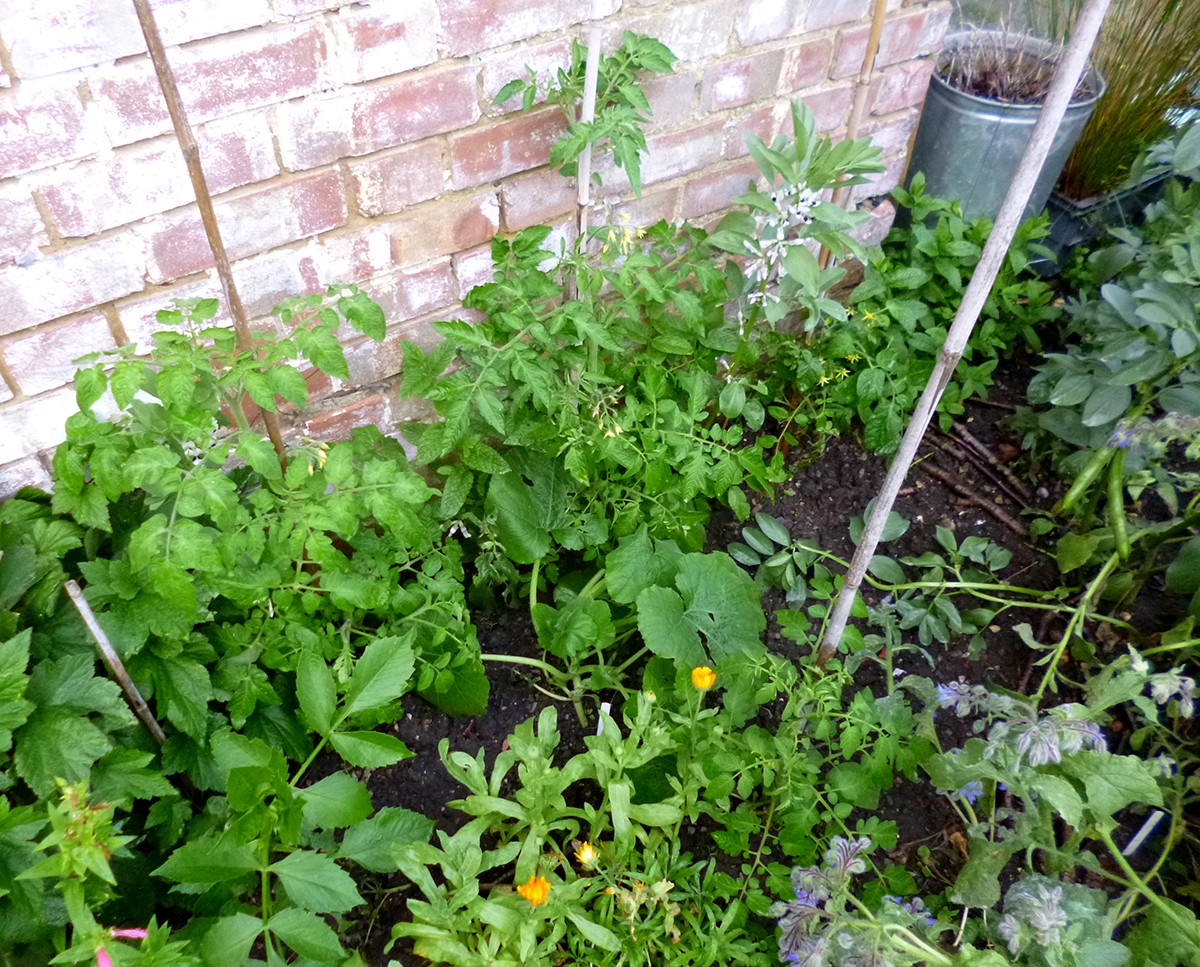 The vegetable bed at the bottom of the garden has moved on since last month. The spuds are on their way, the alderman peas are starting to grow and we’re finally seeing the runner beans germinate. And about time too!