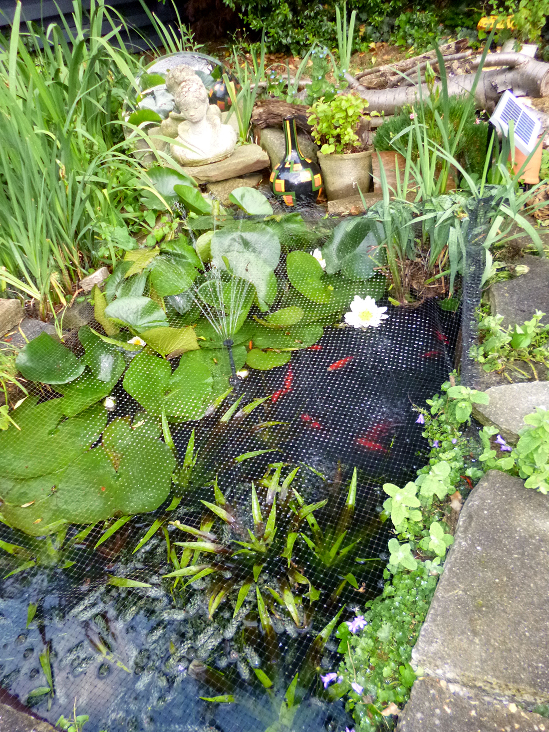I originally thought to shoo it out as I reckoned it would probably half-inch the fish that’s in there but as the picture (below) shows it weren’t bothered, but rather preferred their food which was floating on the top of the pond.